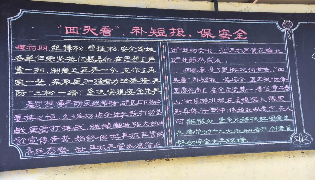 积极营造浓厚的安全生产氛围。该公司通过安全事故案例警示教育、网站开设专栏、张贴安全标语、“回头看”专题展板、黑板报展等方式,大力营造“回头看”活动氛围,努力在干部职工思想认识上再紧一扣。
